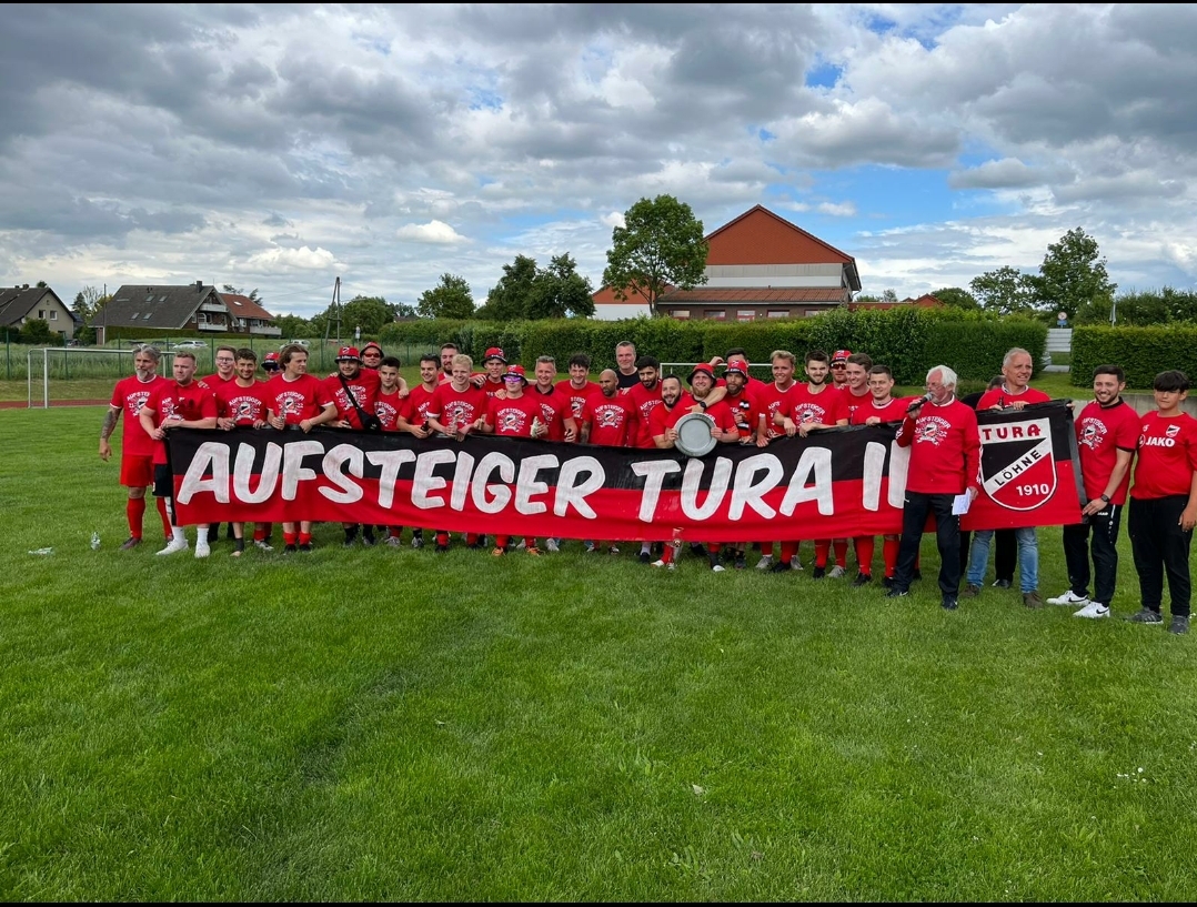 Geschichte geschrieben: Erstmals in der Vereinsgeschichte ist die zweite Mannschaft von TuRa Löhne in die Fußball-Kreisliga A aufgestiegen. Im letzten Saisonspiel der Meisterrunde setzte sich das Team von Maurizio Mazzanova mit 10:1 gegen Muckum/Südlengern II durch – und hatte anschließend mächtig Grund zum Feiern!