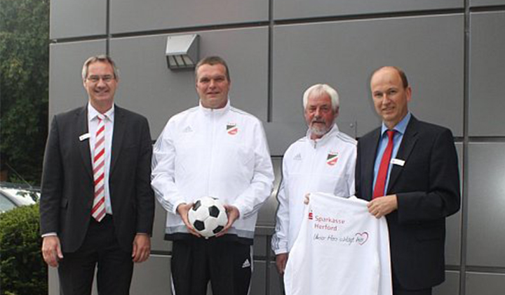 Frank Dinnendahl und Wolfgang Berg, die Vorsitzenden des Altherren TuRa Löhne, freuen sich zum 50-jährigen Jubiläum über die neuen Trainingsanzüge, für die die Sparkasse Herford 1.000 Euro aus dem PS-Sparen bereitstellte. Klaus Sundermeier, Regionaldirektor Löhne, und Stefan Nolting (auch noch aktiver Spieler der Altherren) aus der Sparkassenfiliale Löhne-Ort, ließen es sich nehmen, das neue Outfit persönlich zu überreichen.