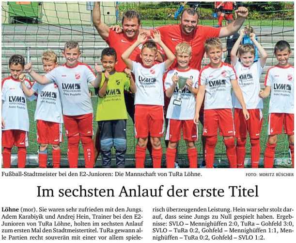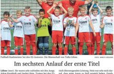 Nach vielen Versuchen und dem gefühlt „ewig 2. Platz“ bei den Stadtmeisterschaften, ist es geschafft und das ganze auch noch ohne Gegentore. Die gute Vorbereitung hat sich nun bezahlt gemacht. Das war eine super Leistung. Der Titel hat noch gefehlt in der Sammlung der E2. Trainer Andrej Hein fällt ein Stein vom Herzen, als auch das letzte Spiel gewonnen ist und der Sieger feststeht. „Es hat richtig Spaß gemacht zuzuschauen“, finden auch die stolzen Eltern. Die Ergebnisse können sich in jedem Fall sehen lassen: TuRa-Gohfeld 3:0, SVLO-TuRa 0:2, und